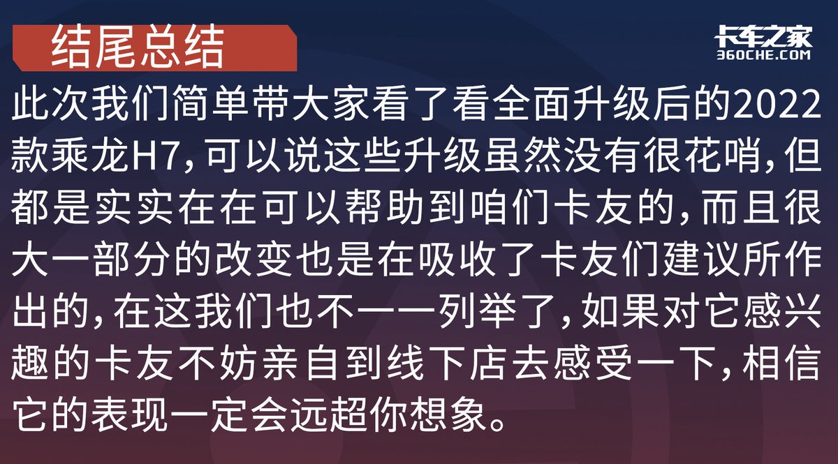 各位卡友如果觉得这台全新2022款乘龙H7还不错,不妨将它转发至微信朋友圈,让更多卡友了解到新款乘龙H7到底做出了哪些升级。(文/图 霍景春、吴昊宸)