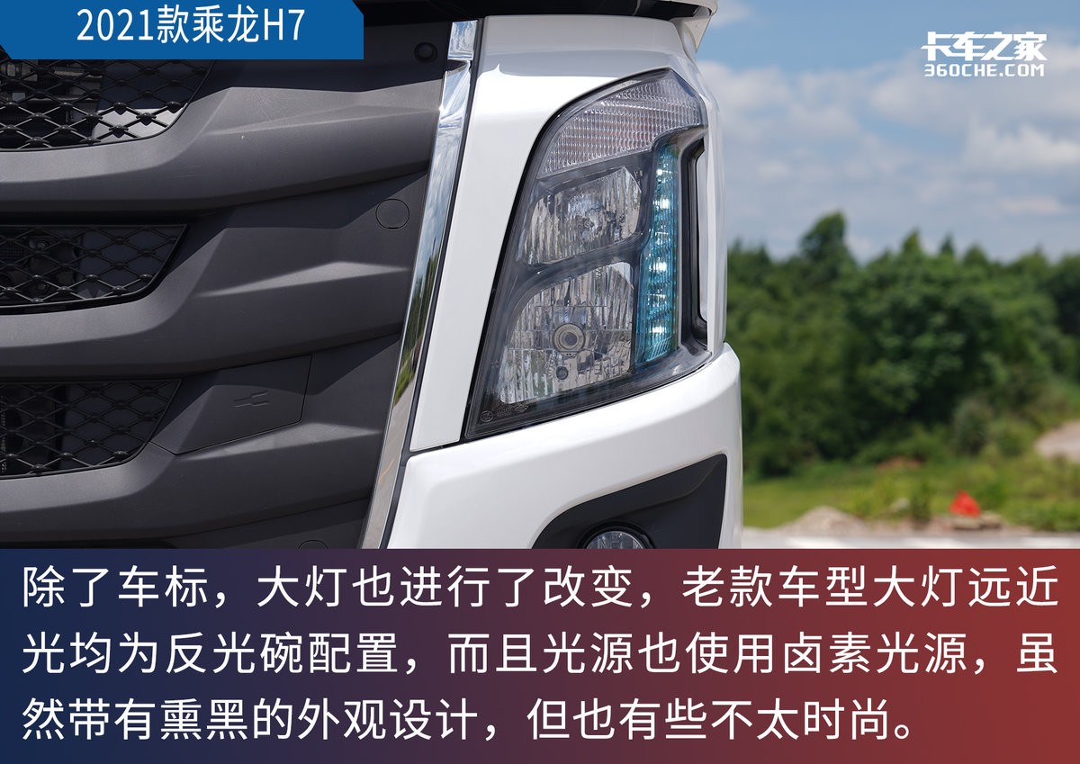 22款乘龙H7则使用了全新设计的大灯,近光使用了透镜+卤素光源,远光使用了LED光源,日间行车灯造型也发生了改变,整套更具有科技感,而且灯光照明效果也有明显提升。