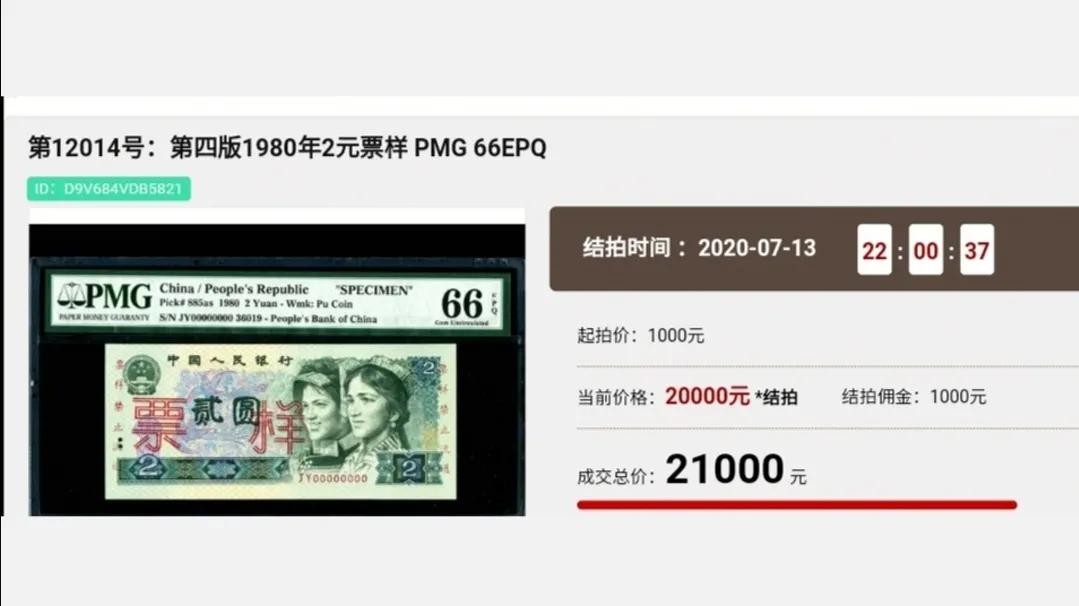 在2020年7月份的“春秋大拍”中,就有一张PMG评级66分的“票样”,拍出了21000元!