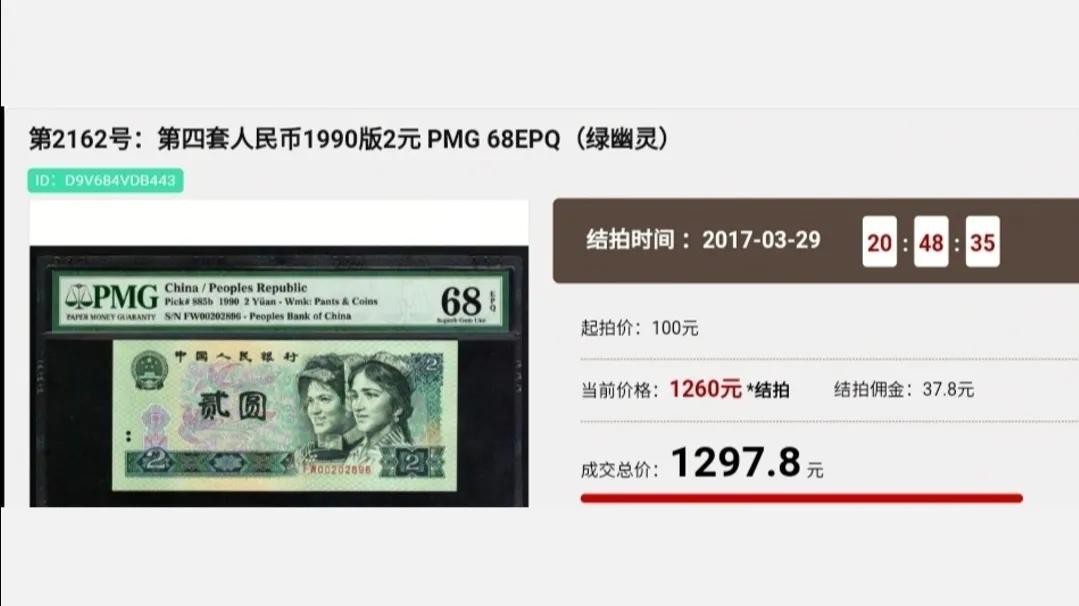 在2017年的一场“春秋大拍”中,一张PMG评级68分的“绿幽灵版”,就拍出了1297.8元!