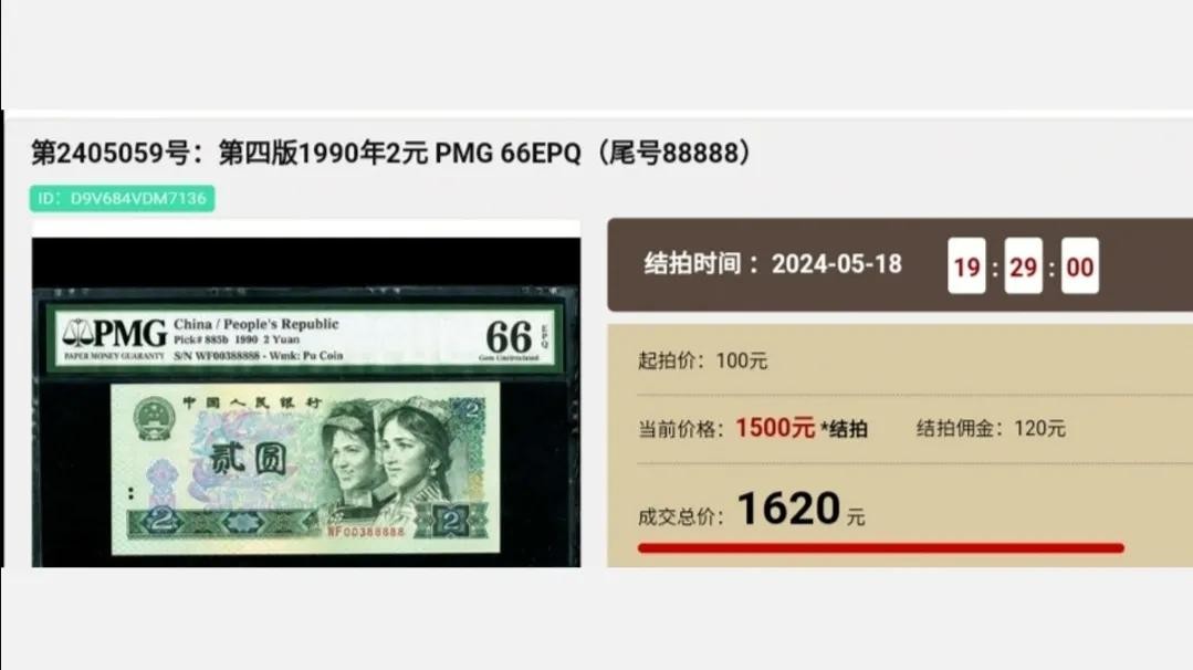 在2024年5月份的“现代月拍”中,一张PMG评级66分的“尾88888”趣味号,就拍出了1620元!