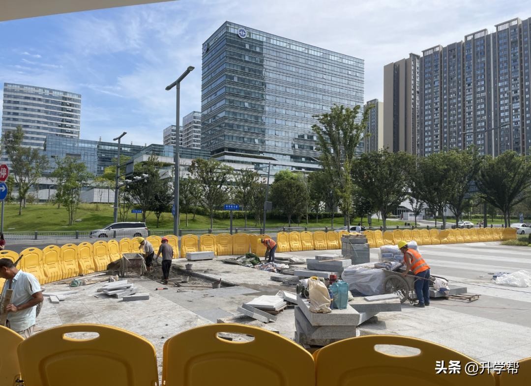 外立面已经挂上了天府新区市民中心的牌子,施工人员正在加紧绿化景观打造和地砖铺设,部分绿化景观已经成形。