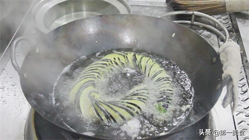 锅中烧油,油温烧至5成热时,把茄子下入油锅炸制,小心地盘好,小火慢慢炸,这个过程差不多要5分钟的时间,最后炸成金黄色就可以捞出控油。