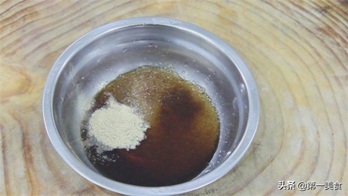 碗中放入两汤勺白糖,两汤勺陈醋,一汤勺生抽,一勺胡椒粉,搅拌均匀之后,加几滴老抽上底色,再次搅拌均匀之后备用。
