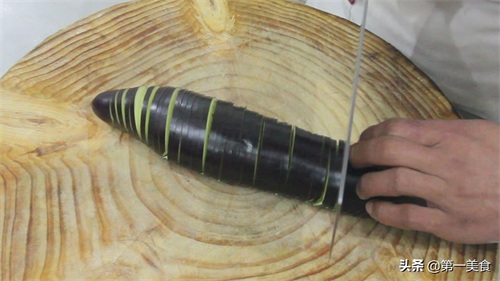 然后,再翻过来,90度垂直于茄子下刀,可以先垫上个粗筷子,这样可以避免不小心切透。