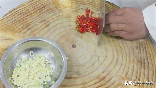 大葱白切成葱花,大蒜拍扁后切成碎粒,泡椒、二荆条切碎。