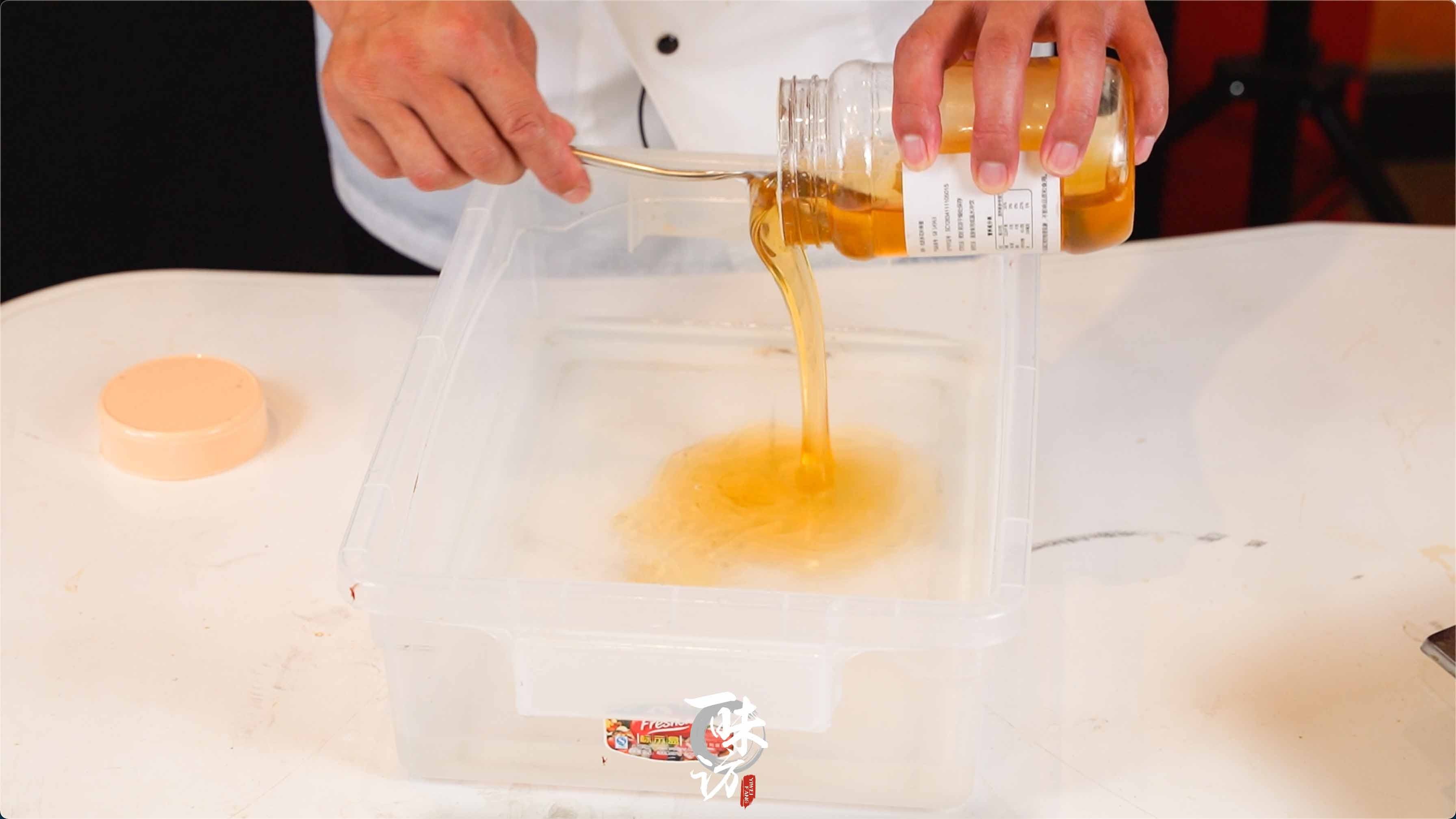 再准备一个大的容器,加入适量的蜂蜜和适量的清水稀释,我们进行裹糖浆,主要就是童子鸡炸的时候表面金黄颜色好看。