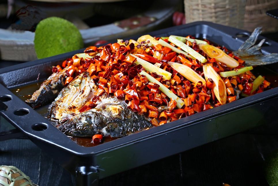 3:将腌制好的草鱼用炭火烤熟至外焦里内装入洋葱丝、藕片、木耳垫底的托盘里4:另起锅加入红油烧热加入拍蒜、干辣椒、麻椒炒香然后