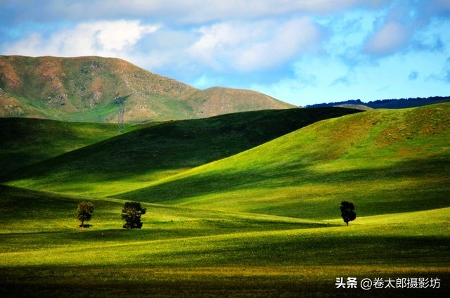 面对宽阔无边的草原,如果使用广角镜头,无法合理构图,没有重点,没有关注点,只能拍出一片绿色,出片反而较为困难。而使用长焦镜头,却可以把视线聚焦到某一区域,体现出这片草原最值得欣赏的光影层次,突出草场上独有的特色景观。