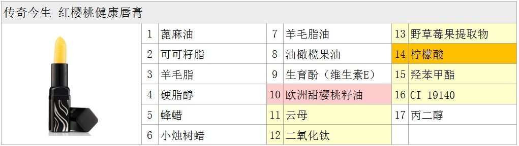 莫叔,求扒一下传奇今生的唇膏,号称原材料都是天然植物萃取,达到食品级标准,安全到可以吃下去......最近被家里亲戚疯狂推销,但是我心里其实并不认同这些微商产品的安全性……产品成分主要是:花青素、天然蜂蜡、维生素c、维生素e、巴西红樱桃……