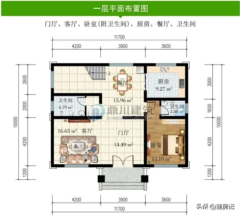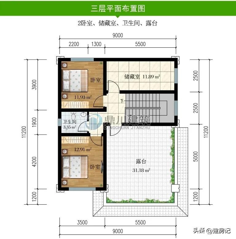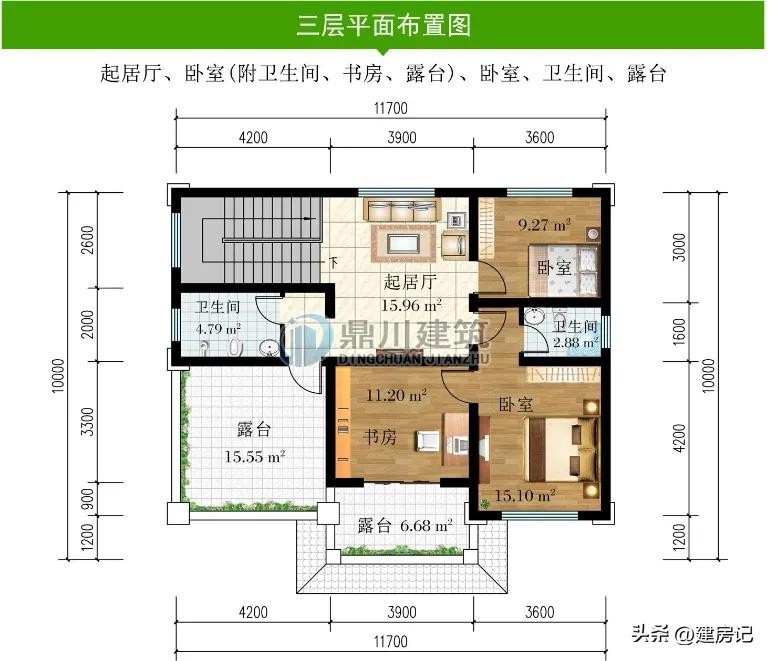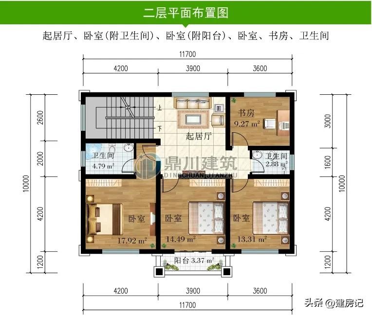 别墅图纸编号: DC0733,砖混结构,开间11.7米,进深10米,占地面积112.91平方米,建筑面积323.75平方米,主体造价33-38万。