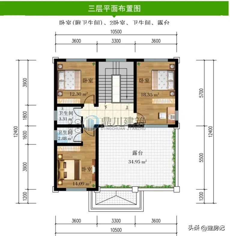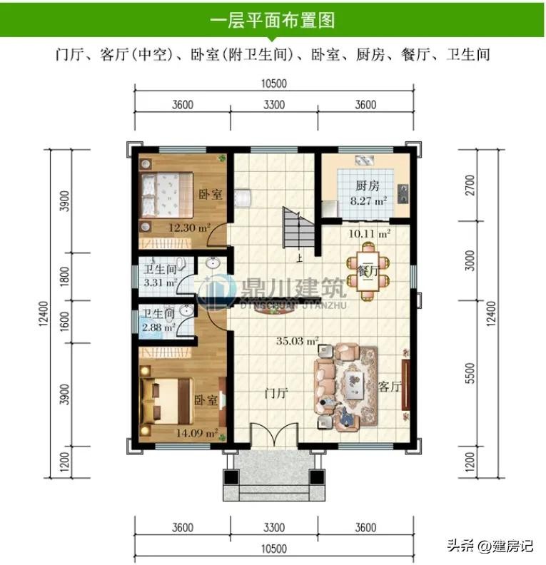 别墅图纸编号: DC0731,砖混结构,开间10.5米,进深12.4米,占地面积127.65平方米,建筑面积324.46平方米,主体造价32-38万。