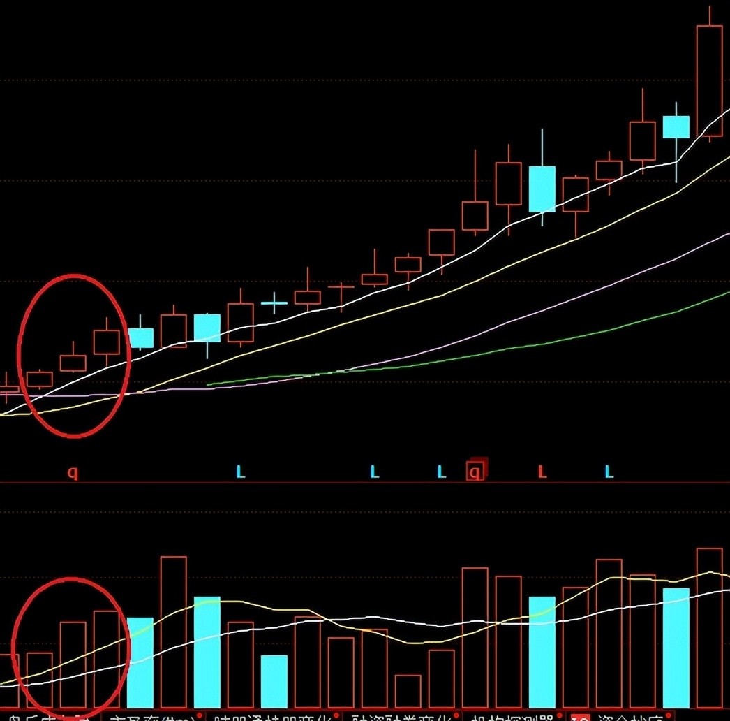 通常在上涨行情初期,连续出现三根中阳线或大阳线,每一天的最高价都高于前一天的最高价,每一天的最低价都高于前一天最低价,且成交量放大,一般为加速进场的信号,此种K线形态称为三阳开泰。