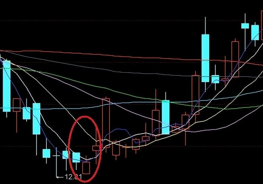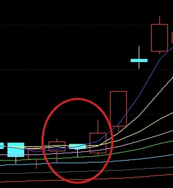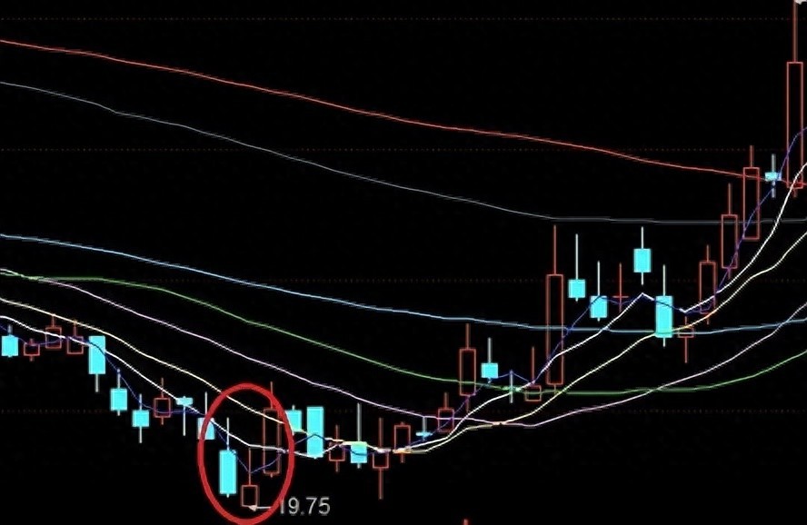 在上涨或下跌趋势中,出现一根中阳线或大阳线,紧接着出现一根实体孕育于阳线实体内的阴线,在阴线之后,又出现一根将阴线完全包住且成交量放大的阳线,这三根K线形成的组合称为多方炮,即两阳夹一阴。