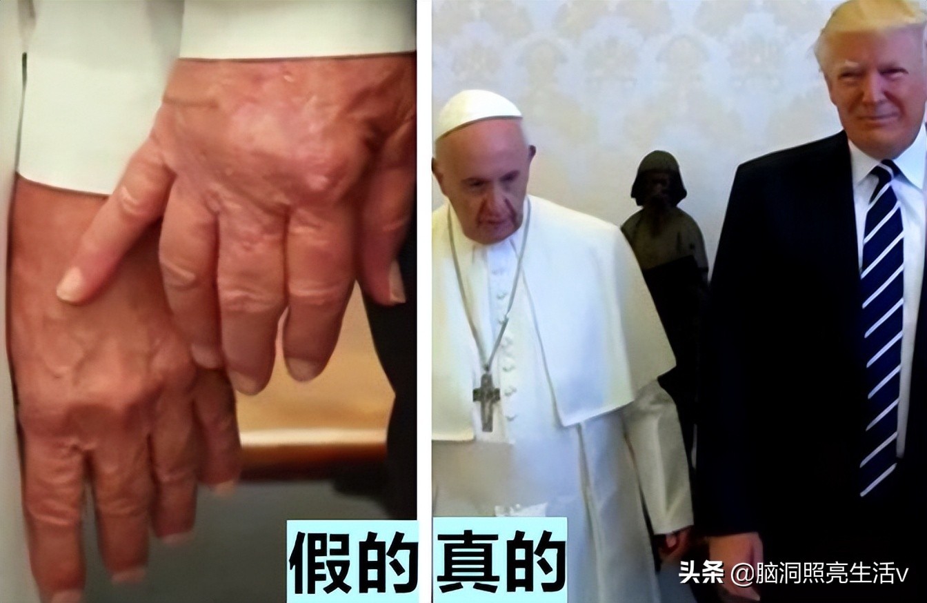 这应该是很多人在网上都看到过的照片,前美国总统特朗普,在梵蒂冈进行国事访问时,试图与教皇弗朗西斯握手的照片,照片里的特朗普,用小拇指接触这位教皇的手,看起来十分的滑稽,虽然这张照片在网络上疯狂,但必须要承认,该照片是假的,因为从放大的手部能够看到,这只手并不是特朗普的,更何况以他的身份,是不可能做这样动作的。