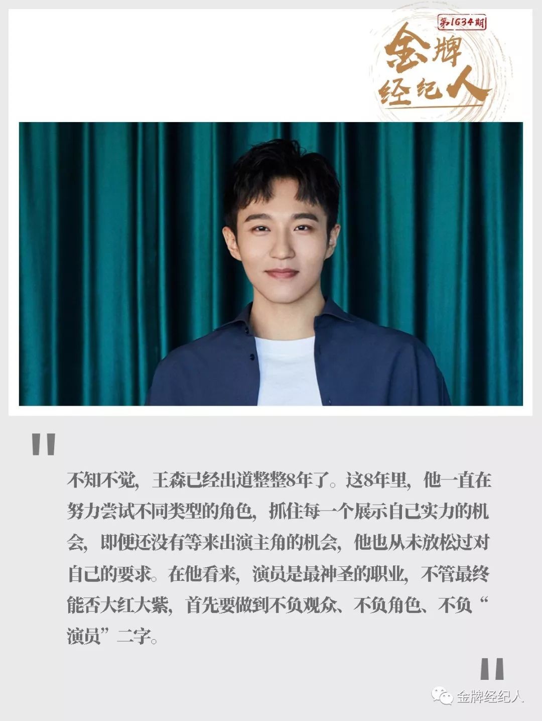 不知不觉,王森已经出道整整8年了。这8年里,他一直在努力尝试不同类型的角色,抓住每一个展示自己实力的机会,即便还没有等来出演主角的机会,他也从未放松过对自己的要求。在他看来,演员是最神圣的职业,不管最终能否大红大紫,首先要做到不负观众、不负角色、不负“演员”二字。