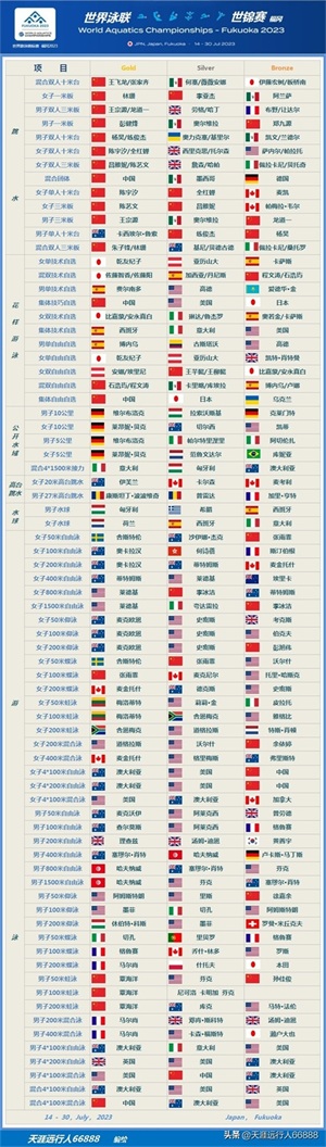 游泳世锦赛金牌奖牌排行榜、冠亚军全名单,75单项金银铜牌全记录