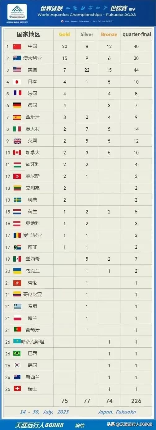 最终在2023世界游泳锦标赛上,中国队共获得20金8银12铜,名列金牌榜第一,列二三位的是15金9银6铜的澳大利亚队和7金22银15铜的美国队,美国队在本届赛事上的表现未达预期。