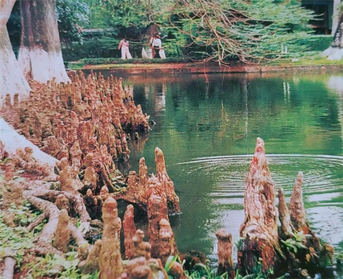 鱼池岸边生长的水松树根很奇特,在国内花卉市场见到过。