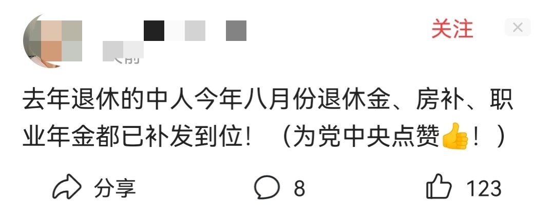 还有江苏的一位2020年的退休中人,今年八月份的养老金,职业年金,还有房补已经补发到位。其实,江苏也是全国最早一批兑现中人的养老金的地方,所以进展一直是领先的。
