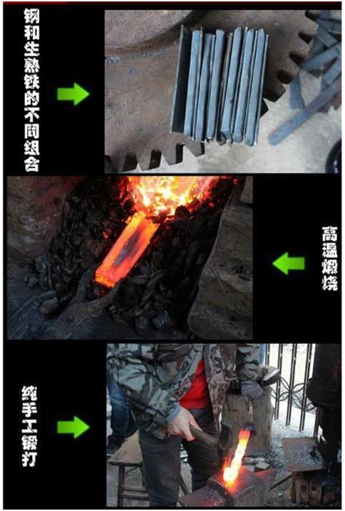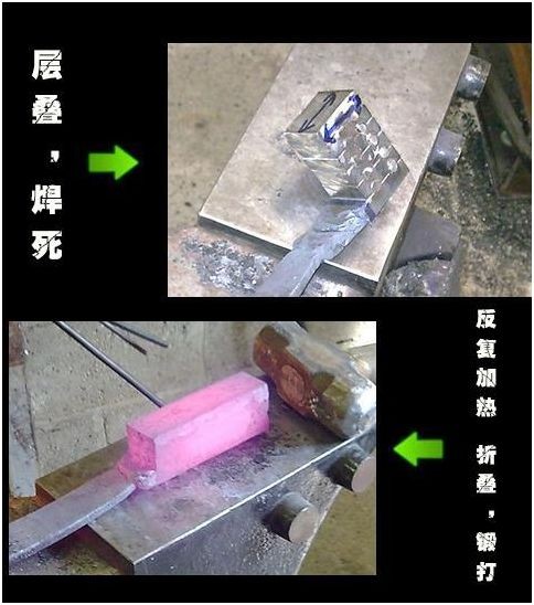 是由不同含碳量的碳钢、软铁或纯镍等材料,经过多次折叠锻打,这样炼就的钢,锋刃坚硬,同时兼具柔韧性。
