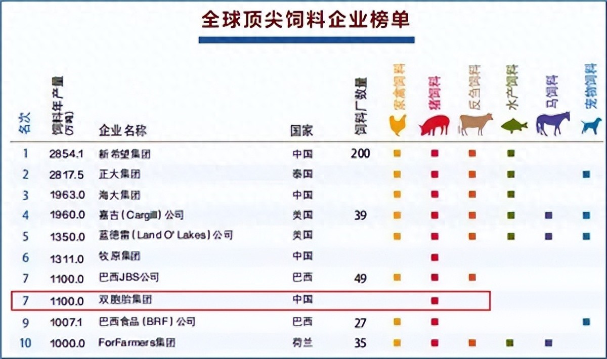 今年9月,WATT国际传媒的全球顶尖饲料企业榜单数据库公布了2021年度全球顶尖饲料企业前十强榜单。榜单数据显示,去年一整年中,全球共有144家动物饲料生产商的复合饲料产量达到或超过了100万吨。国内饲料强企双胞胎集团,也凭借1100万吨的年销量成为全球七强,印证了企业实力。