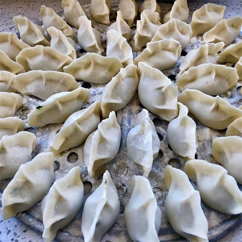 包饺子:取适量饺子皮,将调好的馅料包入饺子皮中,捏紧饺子边缘,做成饺子形状。