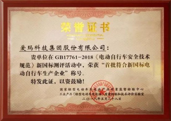 (图注:爱玛“首批符合新国标电动车企业”荣誉证书)