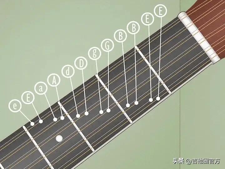 2识别每根弦的正确音符。从吉他上最低、最粗的弦开始,6弦吉他的标准调音顺序是EADGBE。最粗的弦与最细的弦是同一个音符,只是低一个八度。在12弦吉他上,标准调音顺序是eE aA dD gG BB EE。第一个字母代表较粗的弦,而第二个字母代表它们的较细的配对弦。 你可以自己编一些口诀记住标准调音的音符。最常见的有:Eat All Day Get Big Easy(整天吃,变大容易),Eddie Ate Dynamite Good Bye Eddie(埃迪吃了炸药,再见埃迪),和 Every Amateur Does Get Better Eventually(每个业余爱好者最终都会变得更好)。