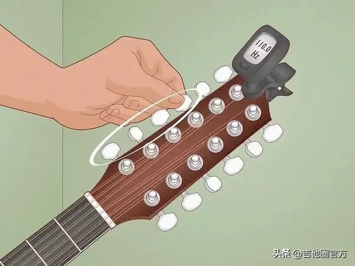 3、找到每根弦的调音旋钮。每根弦都通过吉他琴头上的一个旋钮来调音。跟随每根弦到其对应的旋钮,看看在调音时需要转动哪一个。在调音时,拨动一根较粗的弦,同时转动旋钮,以找出哪个方向会使弦调高,哪个方向会使弦调低。 当弹奏12弦吉他时,记住每对弦一起工作,创造出丰富而闪烁的声音。12弦吉他与6弦吉他之间的唯一真正区别是,你将同时按压和弹奏两根弦,而不仅仅是一根。