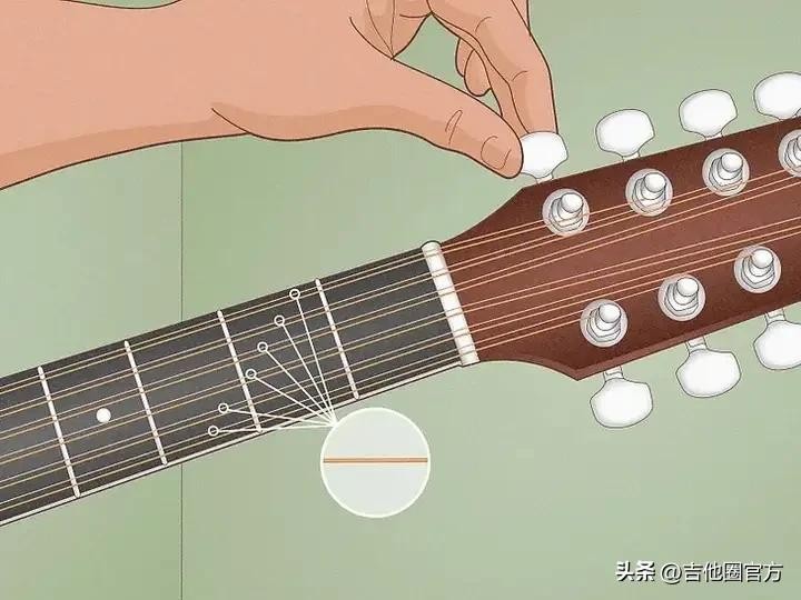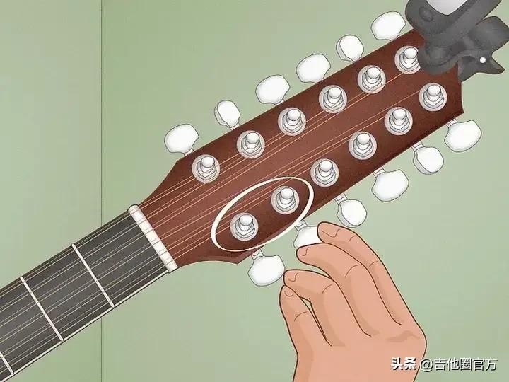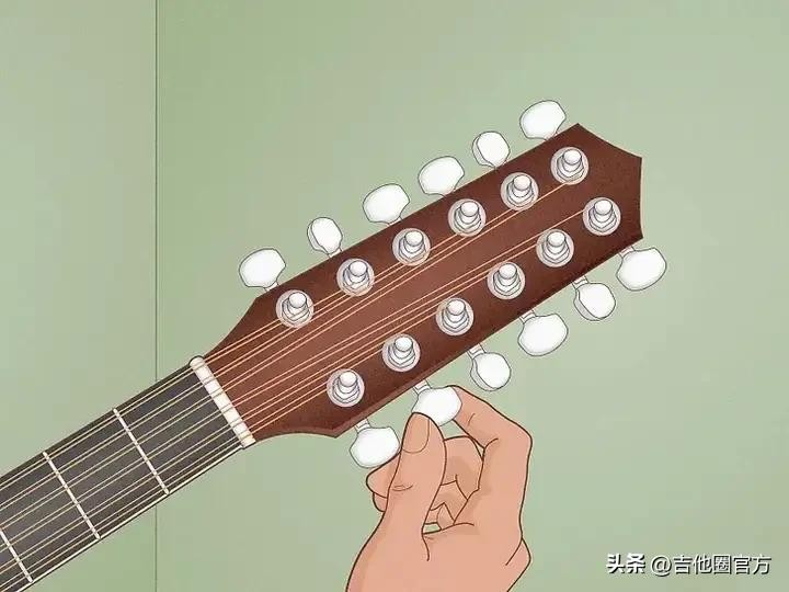 2、在较大的6根弦正确调音后,再调较细的配对弦。记住,较低的四根弦需要比它们的配对弦高一个八度。首先,转动旋钮直到这些弦与配对弦是同一个音符。然后继续转动旋钮,直到这些弦正好比配对弦高一个八度。