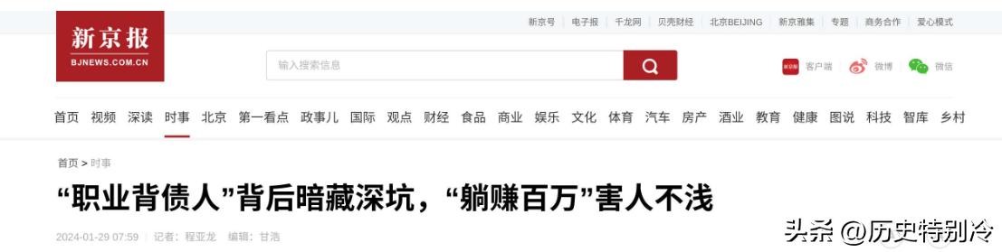 新京报:2024年1月29日,《“职业背债人”背后暗藏深坑,“躺赚百万”害人不浅》