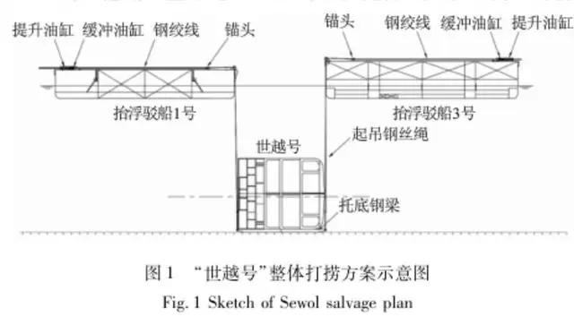 首先投入33根支撑钢梁,并在沉船两端绑上吊索。 然后将提升钢丝的两端连接到船底钢梁端部和双升浮驳船上钢绞线端部。 最后,利用钢绞线液压同步提升的原理,将沉船逐渐打捞出水面,实现了将沉船整艘打捞出水的壮举。