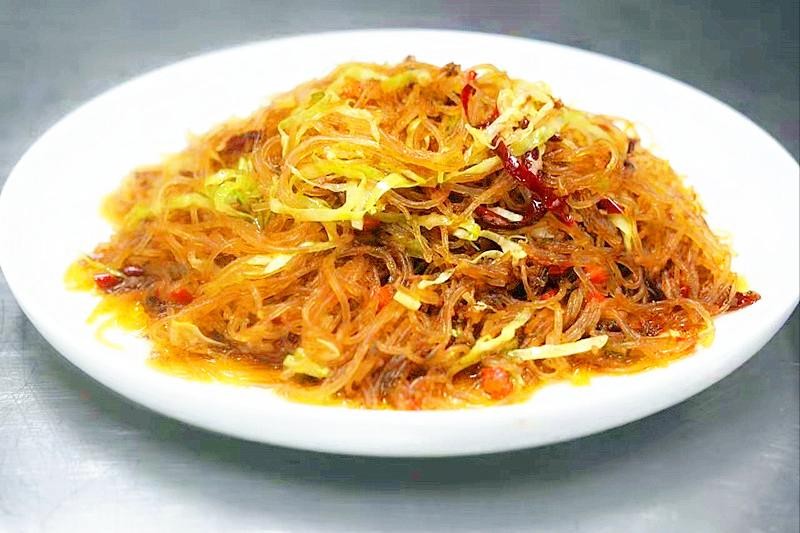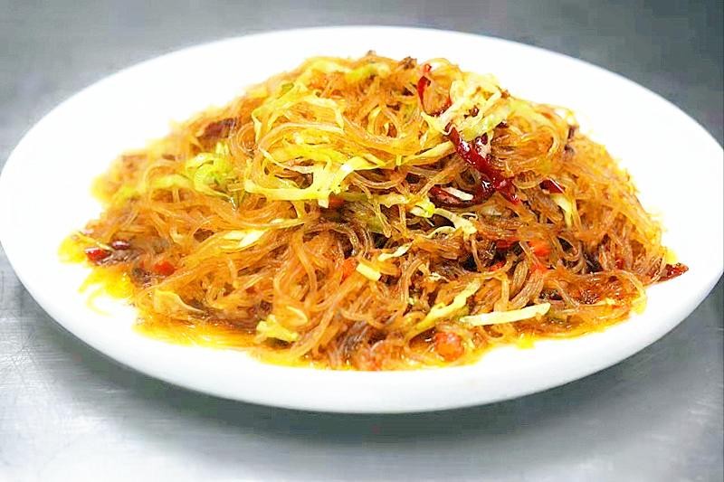 3、炒粉丝时需要用大火爆炒调味后一气呵成,简单快捷待粉丝成熟后装盘就完成了。
