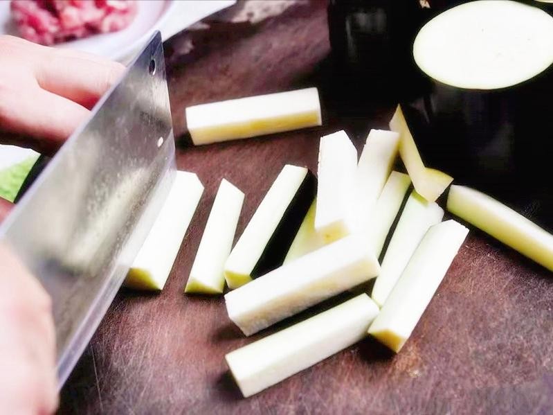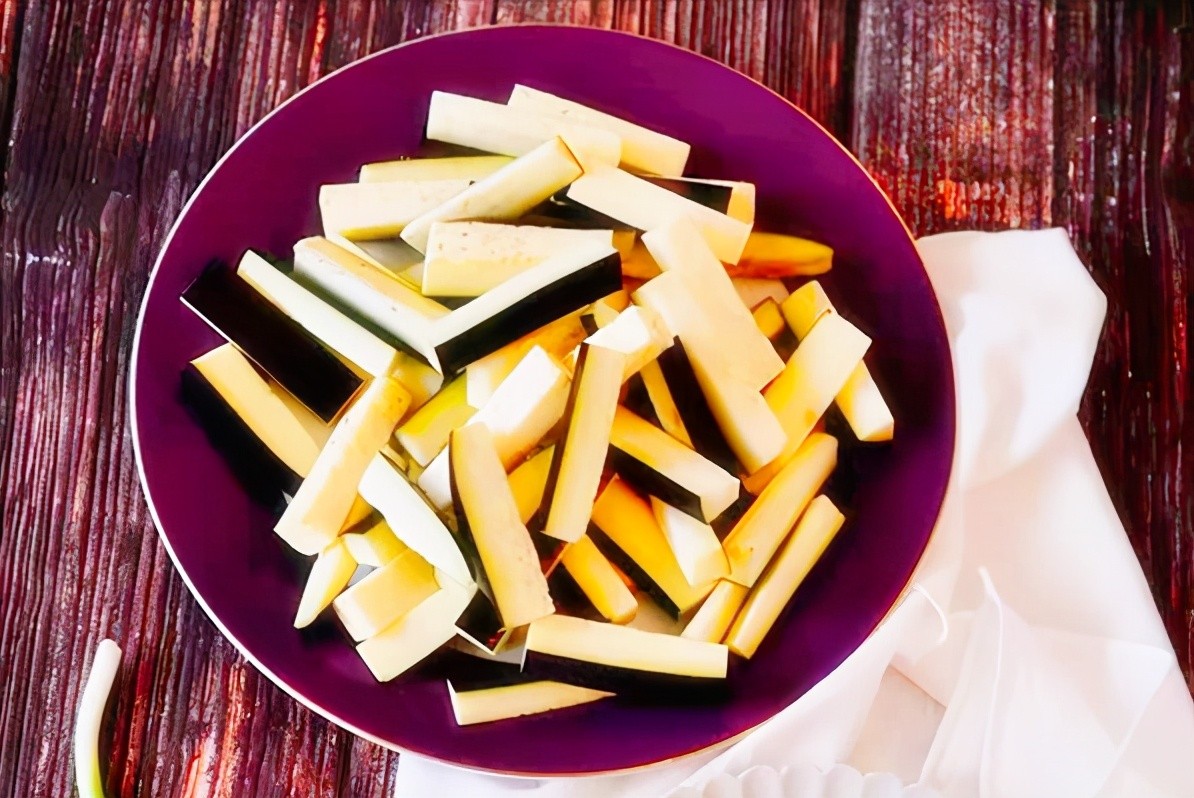1、茄子在切好后不急着下锅的,冲一下水,冲过水的茄子不易变黑。