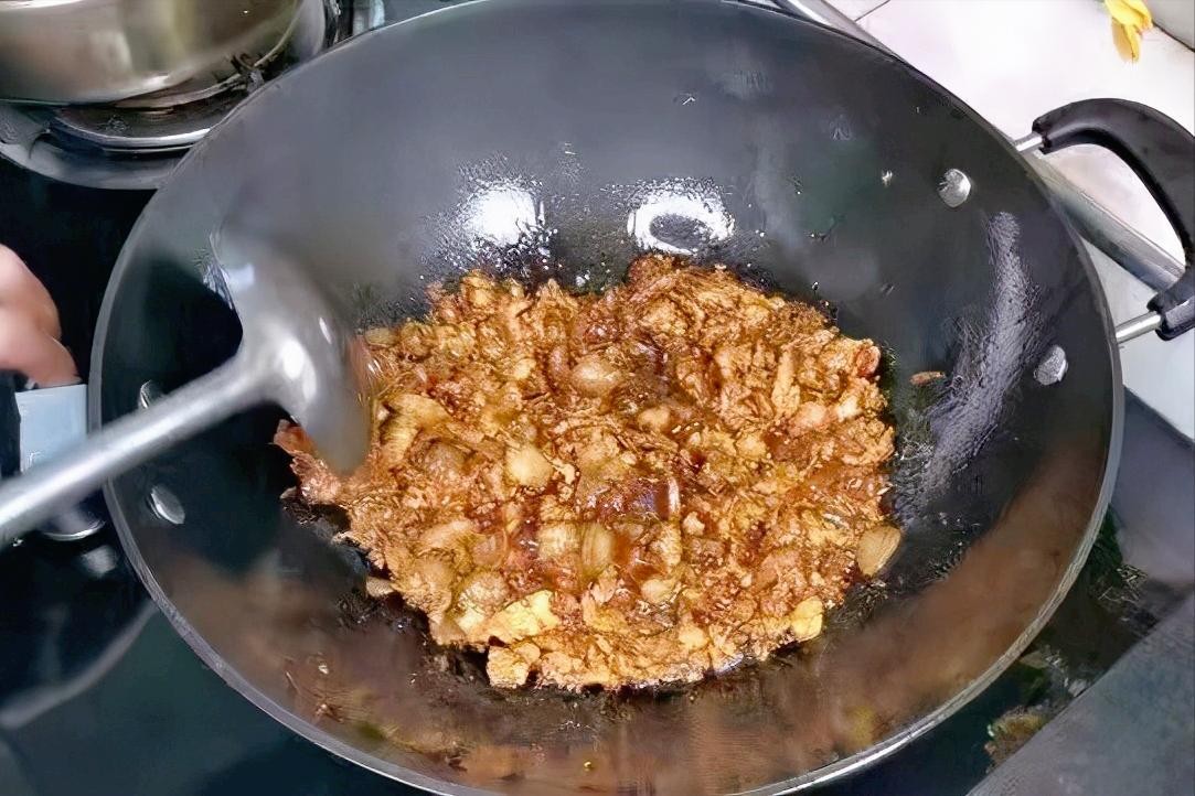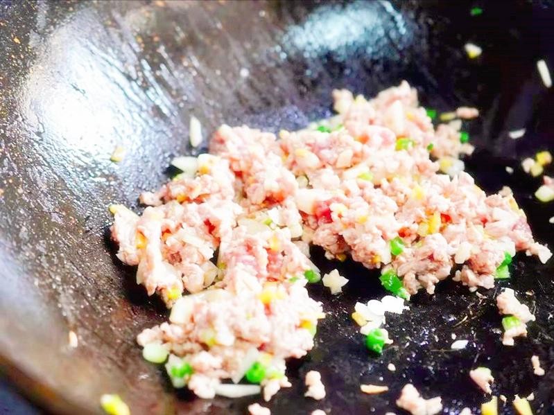 4、锅底留油,尽可能把油控干净,看到锅底没有很多油时,下入肉末煸炒,待肉末炒香后喷入料酒,酒气挥发后加入姜末和蒜末炒香。