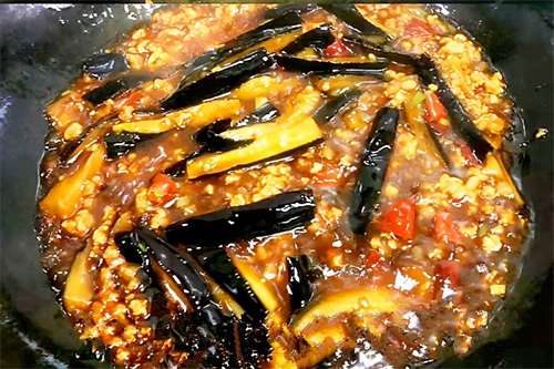 3、在炒制小料时,锅底的油要倒干净,不然在烧茄子时,锅周边的油会流到锅底,茄子看