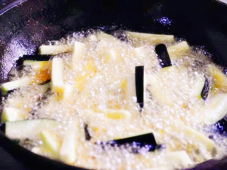 2、茄子在炸制时油温要高一些,当把茄子倒入油锅时,油温会降低,如果油温不够茄子容