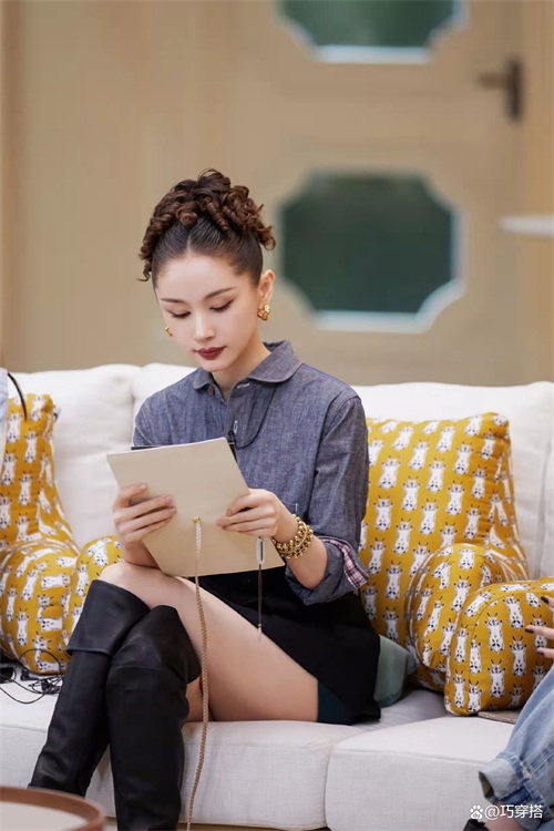 这一头“奶奶卷”发搭配上中性色系的基础款牛仔衬衫以及相对保守的黑色短裙,延续着一贯的个性风格;通过衬衫下摆全塞衣角的穿法巧妙提高腰线,不知不觉间完善自身的身材比例;脚踩高筒皮靴,更是美化腿部线条的神器。整体造型中发型成为亮点,同时也将熟女风感觉拉满。