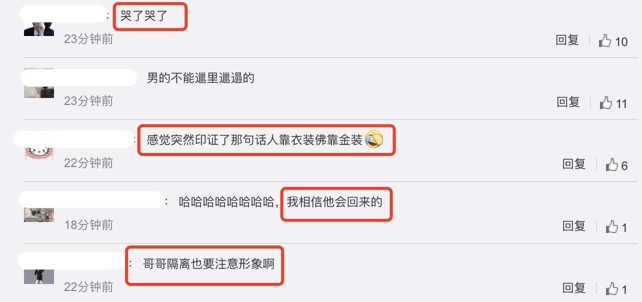 网友们的留言也是笑点十足:超级赛亚人?感觉自己越来越配得上他了!今天不再为容貌焦虑,与自己和解!哭了哭了,我相信他会回来的!哥哥隔离也要注意形象啊!印证了那句话“人靠衣装”!