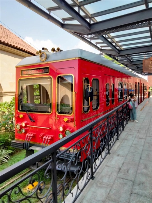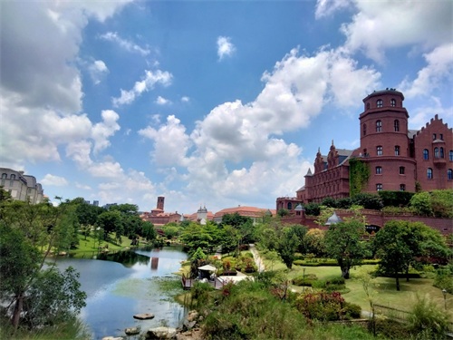 公司为了方便员工工资休息,把基地分为A、B、C、D、F、E几大公能区,每个功能区都有工作、休息、休闲、食宿的地方,几大功能区有小型铁路相连,小铁路一共有三个条,分别连接这几个区,方便的很。在基地游览,犹如到了世界各地,各式建筑应有尽有,欧式建筑古朴典雅,亭台楼阁,湖泊溪流,树木苍翠,让人流连忘返真是一个好地道,一个让人去了还想再去的地方!