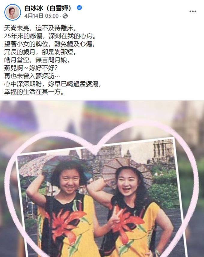 前两天是女儿白晓燕去世25周年,白冰冰在个人社交账号上晒出母女合影,发文悼念爱女。她写道,天尚未亮,就迫不及待起床,25年来的伤感,深刻在我的心房,望着女儿的牌位,难免触及心伤,冗长的岁月,却是刹那短……。一字一句,充满了她对女儿的思念。
