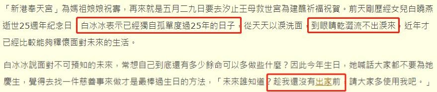 这次露面,白冰冰再次谈及了女儿的死。她坦言已经独自孤单度过了25年,从天天以泪洗面,到眼睛干涩到流不出眼泪,这几年才逐渐释怀面对未来。只是,面对无法预知的未来,自己到底还有多少时间可以多做些什么呢?