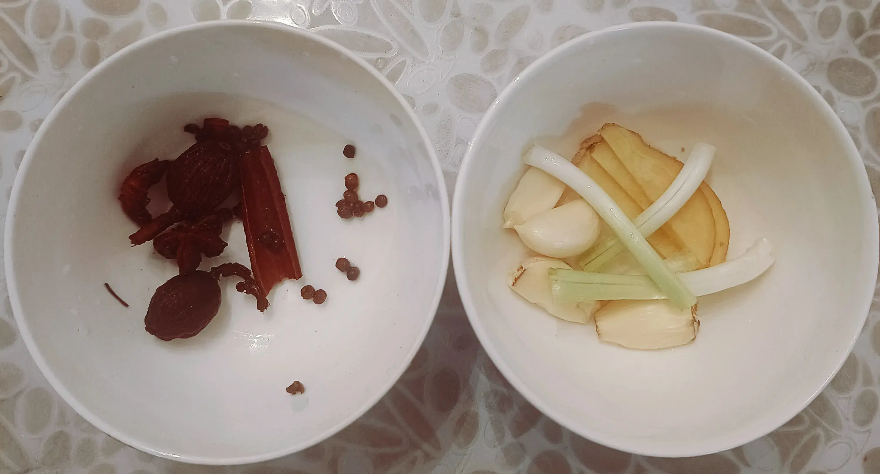 1.准备好香料(八角、桂皮、草果、花椒),蒜头去皮,姜切片,葱切段备用;