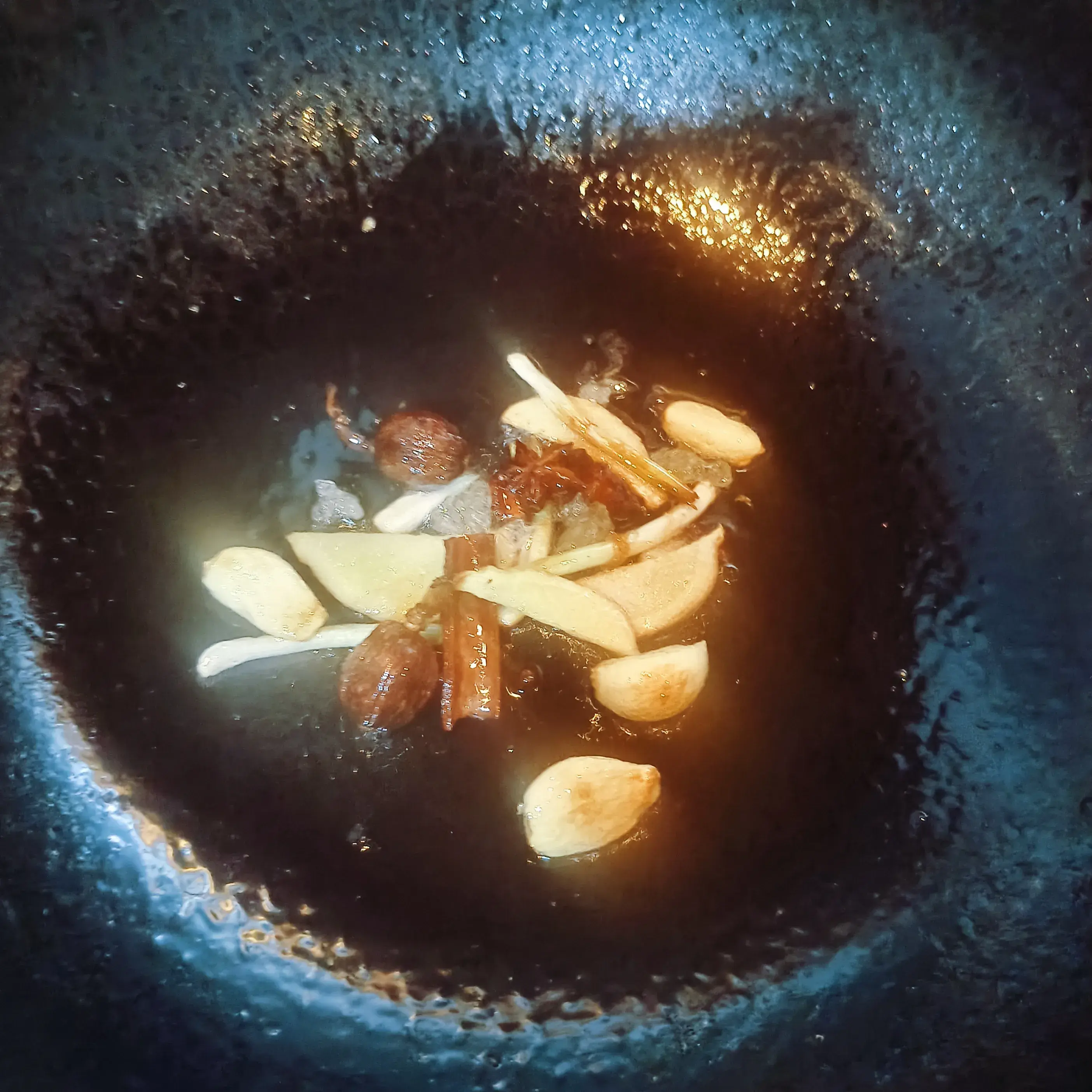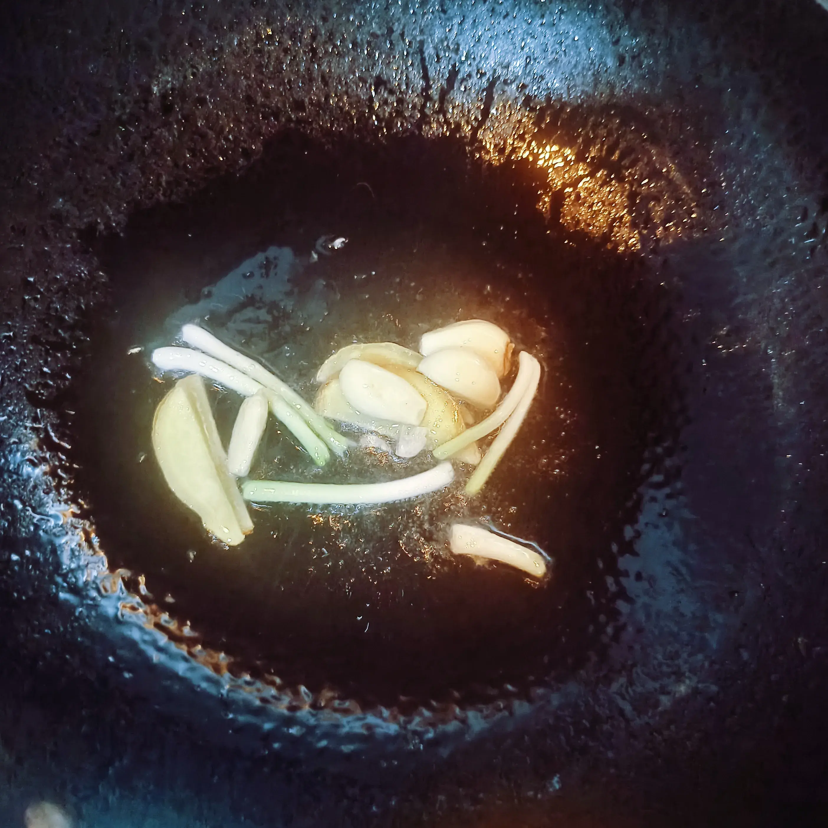 3.小火热锅倒油,油八成热下姜片、蒜头、葱段炒香;