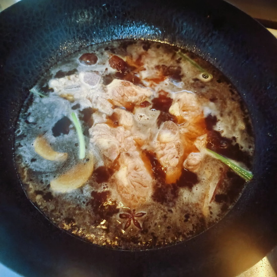 5.下冰糖、豆豉炒香,再加生抽、蚝油、盐和适量开水,放入脊骨,水将没过脊骨,大火烧开后转小火炖半小时以上,炖到自己喜欢的软烂程度,最后收汁即可