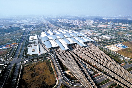 用钢量超过北京鸟巢的广州南站,占地面积超37万平方米,是亚洲最大的火车站。连成一片的钢结构屋顶,酷似科幻电影中的太空堡垒。堡垒中,武广高速的瞬间地移,让乘客享受“超越时空”的体验。乘客在堡垒内可以实现铁路、地铁、公交车、出租车等交通工具的直接换乘,是全国第四大综合交通枢纽。