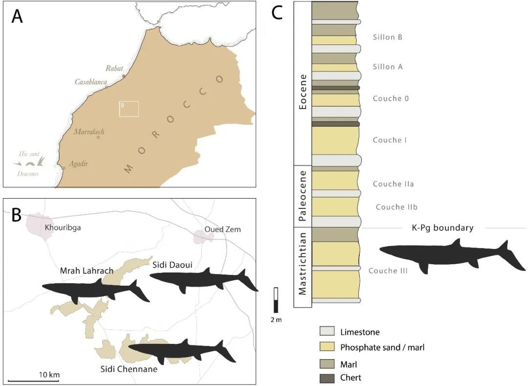海巨龙的化石来自于摩洛哥的奥拉德阿卜杜恩盆地(Oulad Abdoun Basin),这里发现了大量的白垩纪海洋生物化石,年代可以追溯到距今6700万~6600万年前的白垩纪最末期,此时霸王龙和三角龙还生活在北美洲,而海巨龙就是当时非洲西北部海洋中的绝对王者,它甚至是没有天敌的。如果说有,就是同类,因为古生物学家在许多海巨龙的标本中都发现了咬痕,而这些咬痕恰恰就是同类留下来的,看来海巨龙的种内竞争是相当激烈的。