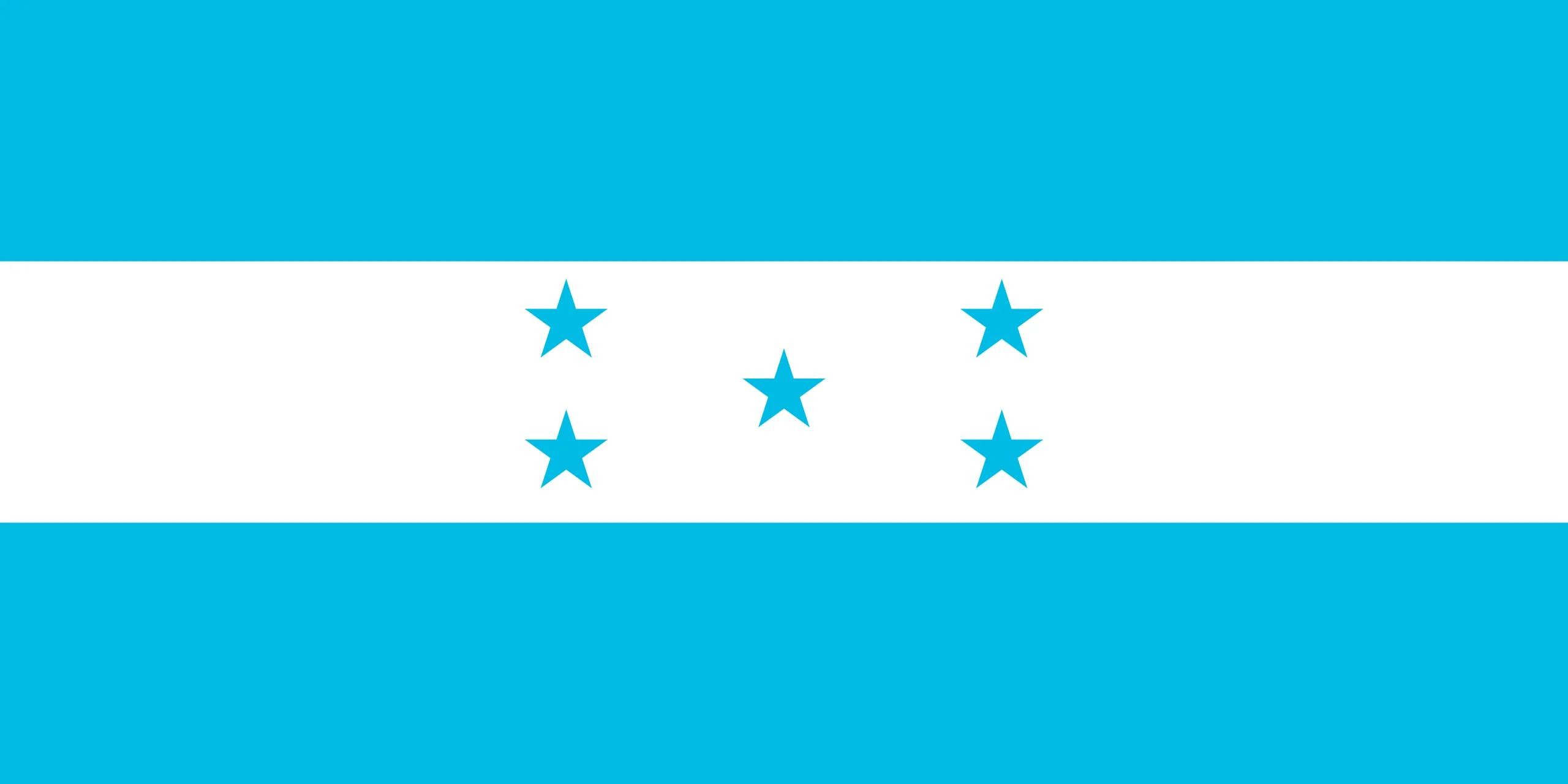 洪都拉斯国旗启用于1949年1月18日,国旗呈长方形,由上下两道蓝色的横条和中间一道白色横条外加5颗蓝色五角星所构成,国旗颜色来自原中美洲联邦国旗的颜色。两道蓝色横条寓意洪都拉斯位于加勒比海和太平洋之间;中间的白色横条代表洪都拉斯民众对和平的热爱;五颗五角星寄托了洪都拉斯民众对组成原中美洲联邦的五个国家能再次实现联合的愿望