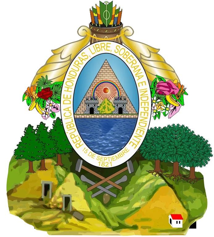 洪都拉斯国徽启用于1825年,盾面上绘有一座石垒的金字塔,象征平等和正义。金字塔周围的海洋,表示洪都拉斯位于加勒比海和太平洋之间的地理位置。金字塔背后的蓝天和彩虹象征对未来的向往。用金黄色装饰的金字塔门廊和两侧的城堡,象征国家主权和独立自主。盾徽周围为两条蓝边,蓝边中间是一条椭圆形白色宽带,宽带上用黄色西班牙文书写着“洪都拉斯共和国,1821年9月15日”和“自由、主权、独立”的字样,盾徽两侧各绘有一只装满玫瑰的羊角。盾徽顶端饰有一筒各色的羽箭。盾徽置于一座褐色丘冈上。丘冈两侧长有橡树和松柏,象征国家的力量。丘冈上绘有各种劳动工具,象征国家对人民的号召:用荣誉和劳动来培养国民的民族意识。盾徽底部的绿色原野上绘有玛雅人的住房,表示洪都拉斯历史上曾是玛雅文化的发祥地之一